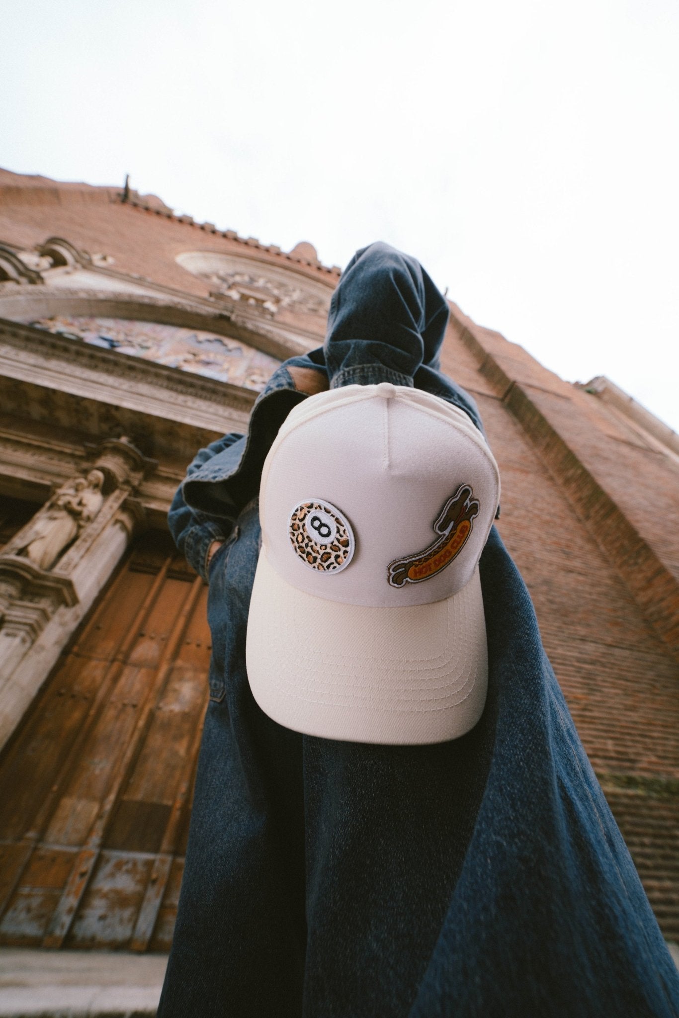 Personne en veste en jean cachant son visage, portant une casquette Muzo beige avec des patchs devant un bâtiment ancien.